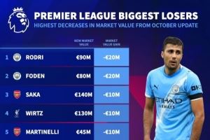 体育资讯10月17日讯 德转统计了最新的英超球员身价跌幅榜单,曼城中场罗德里和福登身价均下降2000万欧元,分列前二,阿森纳四人上榜。